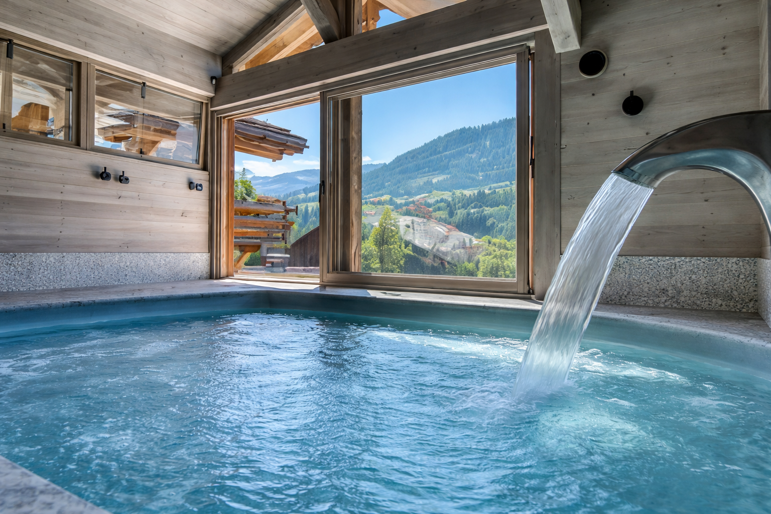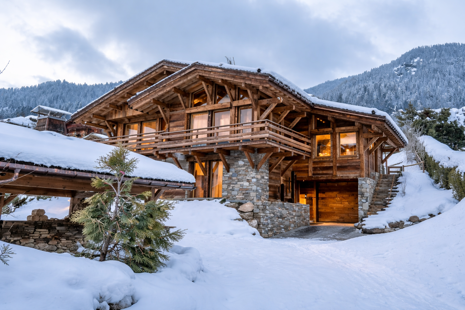 Modern, warm and refined luxury chalet located in Megève, designed with premium materials where wood blends harmoniously with stone, glass and metal while respecting traditional Alpine architecture. The chalet offers cozy living spaces and uniquely designed rooms with mountain views, private terraces, high-end bedding and modern amenities, creating an elegant and relaxing mountain retreat ideal for families or groups.